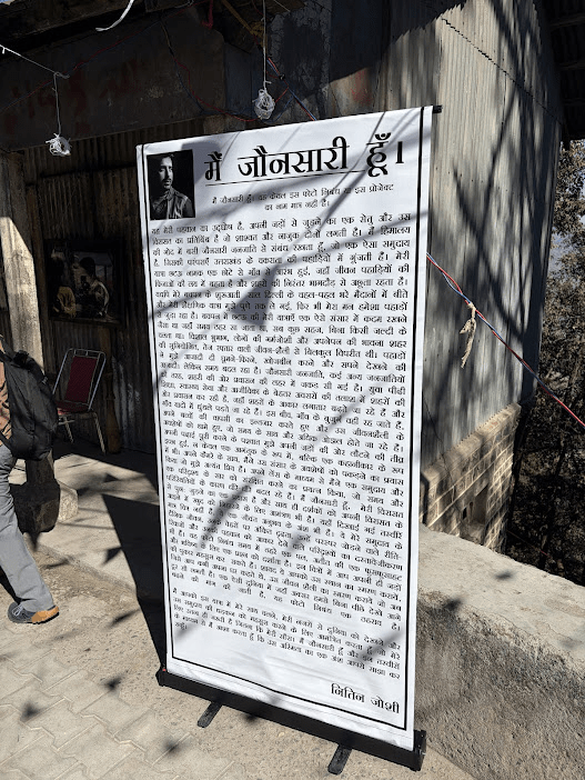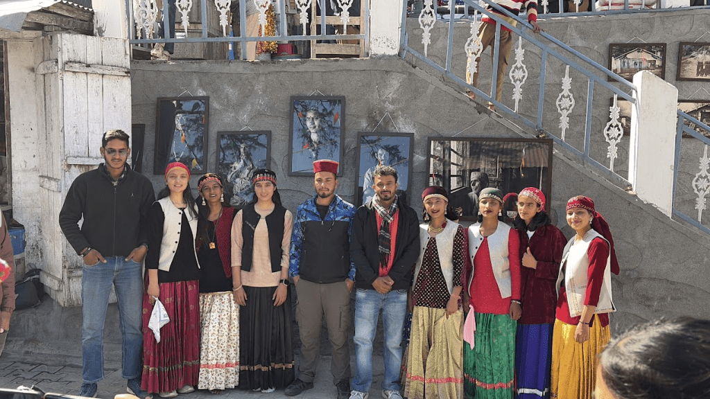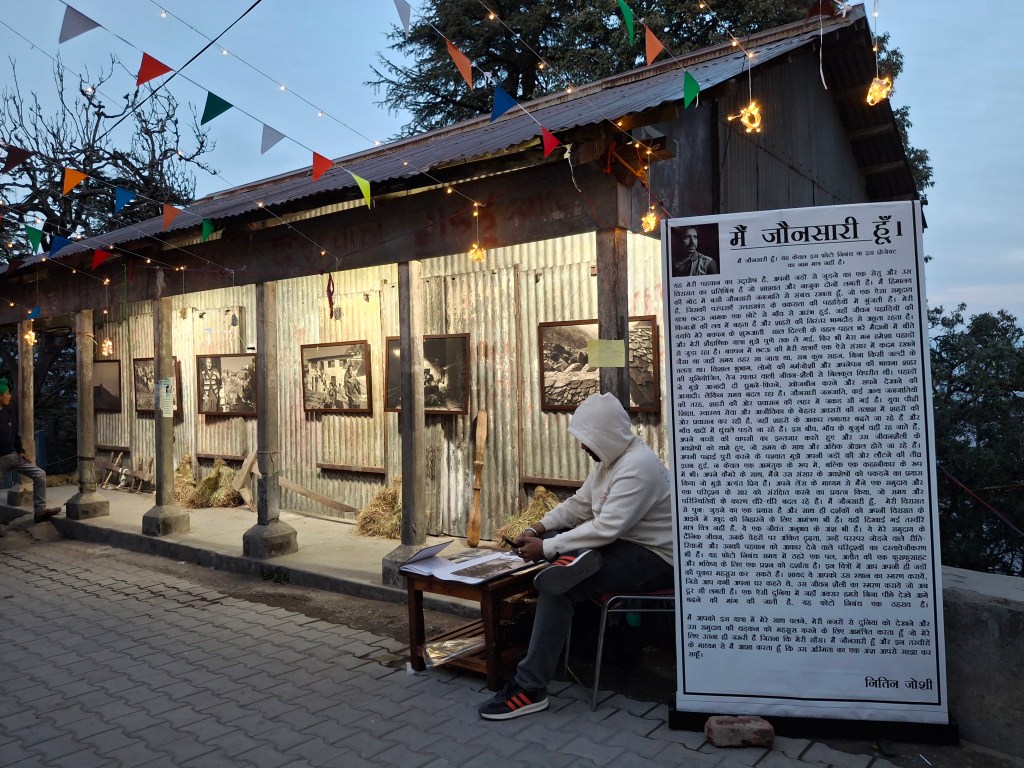 Among the whirlwind of Nati dances, artisan and food stalls and local music, one of the most powerful moments of the carnival happened in a quieter space. Our mentor, Nitin Joshi, had set up a stunning photo exhibition titled “I am Jaunsari.” As a native photographer, Nitin’s work doesn’t just capture faces; it captures the soul of the soil. Walking through the exhibition was like seeing the region’s heartbeat – the wrinkles of the elders, the vibrant traditions of the festivals, power of women and the quiet dignity of daily life. It served as the perfect introduction to the people we were about to spend the next few days with.